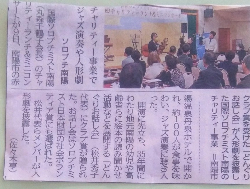 チャリティーランチ&ミニコンサートは今年で3回目をむかえました。「水上まり トリオ」を再びお迎えし、ジャズの歌声と演奏をお客様に楽しんでいただきました。開演に先立ち、今年の日本財団社会ボランティア賞を受賞した「どんぐりお話会」様にクラブ賞を贈呈しました。「どんぐりお話会」の皆様には、飛び入りで人形劇をご披露いただき、会場から大きな拍手がおくられました。今年は直前に会場が変更になるというハプニングがありましたが、会員一同力を合わせて準備し、皆さんに喜んでいただいたことが大成功につながりました。次もくるよというお客様のお言葉に感謝の気持ちでいっぱいです。