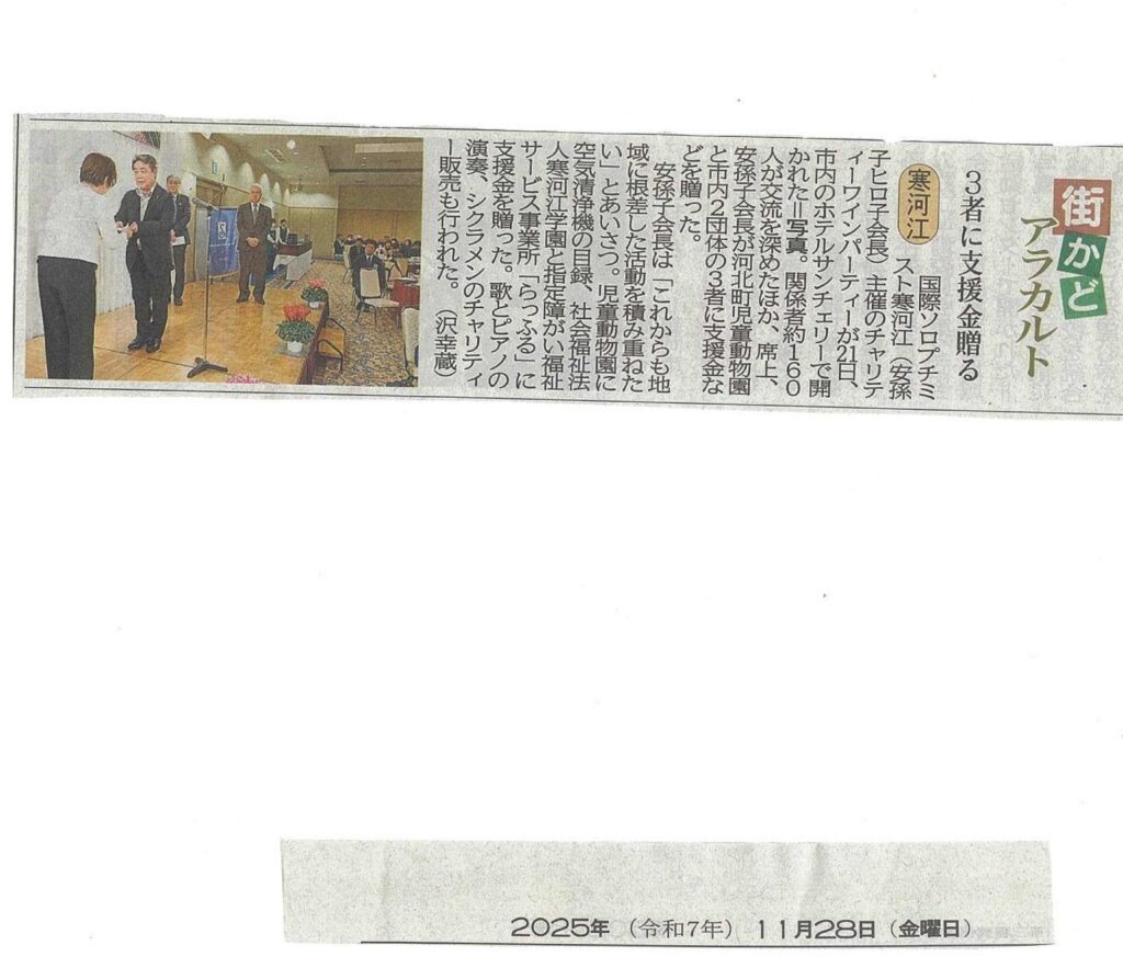 第16回チャリティーワインパーティーが11月21日160名の参加で賑やかに開催。遠く盛岡より篠村ガバナーもおいでくださり、会員一同緊張の中にも和やかな「おもてなし」ができたようです。地域への寄付として、今年は河北町へ。児童養護施設寒河江学園と指定障がい福祉サービス「らっふる」にそれぞれ支援金贈呈をおこないました。齋藤市長様、篠村ガバナー様よりご挨拶を頂いた後、演奏は♪ビートルズ♪♪、会場は一気にワインパーティーとなり、芳醇な香りに満たされました。長くご協力頂いている地元のトラヤワイナリー様の選りすぐりのワインが各テーブルに、さらにたくさんのワインが並ぶカウンターにとワイン好きにはいつも大好評。おいしい料理と素敵な歌姫とピアノ演奏で会場は大盛り上がりとなり、シクラメン販売もお客様のご協力で順調に終了しました。約2時間、髙田実行委員長のお礼の言葉で結びとなり、これからも地域にねざした活動を積み重ねていけるよう、この度の収益金も大切に使わせて頂きます。