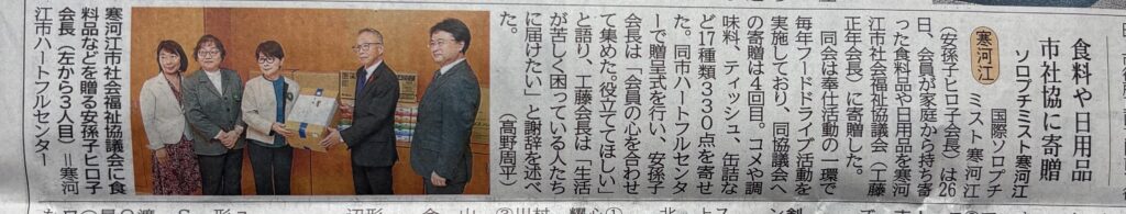 今年度で4回目となるフードドライブ活動を実施しました。会員全員で自宅で使いきれない食料品や日用品を持ち寄り、生活に困難を抱えている家庭に支援をつなげることを目的としています。例会で集めた品物は、賞味期限や状態を一つ一つ確認し、麺類やタオル等種類別に仕分けを行いました。約140個を箱詰めして、翌11月26日に会長、担当委員会で寒河江市社会福祉協議会にお届けしました。社会福祉協議会より「必要とする方々への配布に活用させて頂きます」との感謝の言葉をいただき、会員にとっても地域の現状を改めて知る貴重な機会となりました。「誰かを思いやる奉仕の心」で今後も女性と子供、そして地域への継続的な支援活動に取り組んでいきたいと思います。