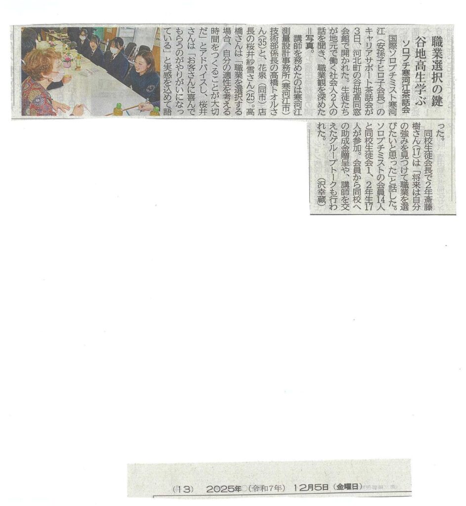 12月3日、山形県立谷地高等学校において「夢を拓く:キャリアサポート茶話会」を開催しました。谷地高校生徒会17名、教頭先生はじめ担当の先生4名、SI寒河江会員14名の参加でスタート。Sクラブへの助成金の贈呈の後、生徒会長より活動報告をいただきました。茶話会では、今年は2名の社会人を迎えての基調講演を行いました。現在、測量設計事務所の技術部でお仕事をしている30代の高橋さん、もう一人は生花店で店長を務める20代の櫻井さん。学生時代に夢みたこと、そのために行動したこと等も含めて職業を選択する時に「自分の適性を考える時間を作る」「自分の強みを見つける」等を話していただきました。年齢が近いこともあり、将来の夢の実現に向けて貴重なアドバイスとなったようです。