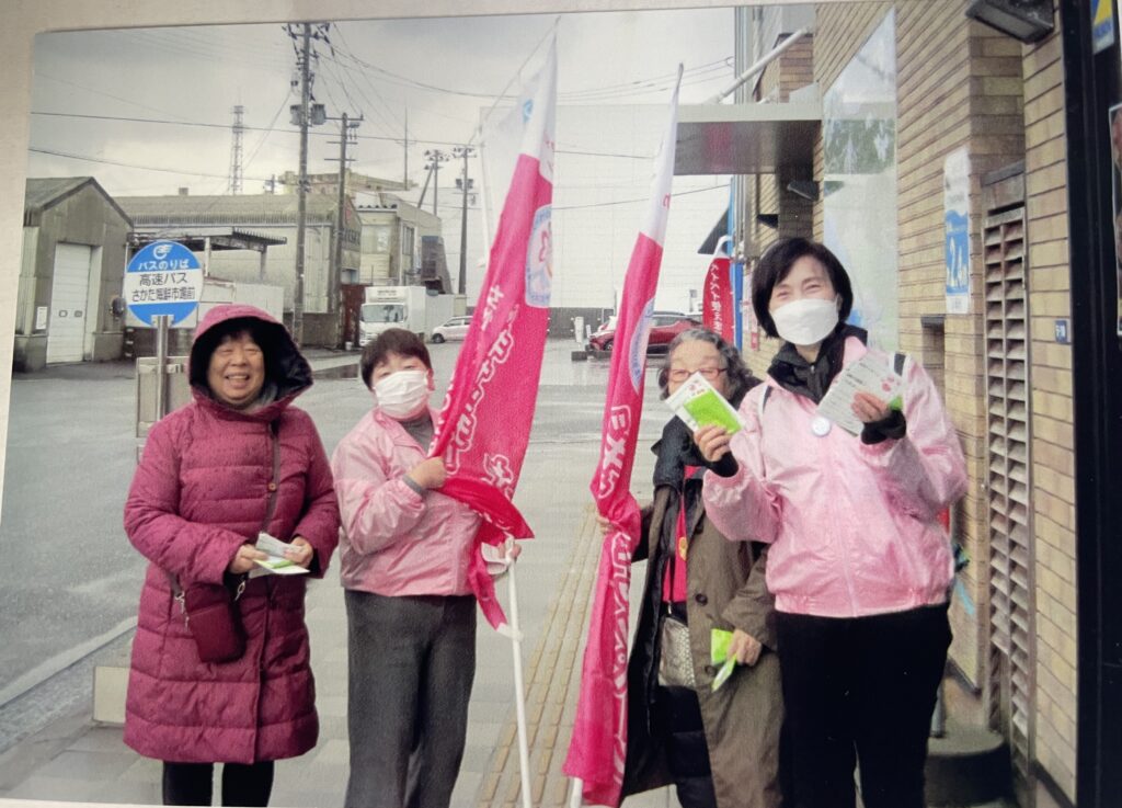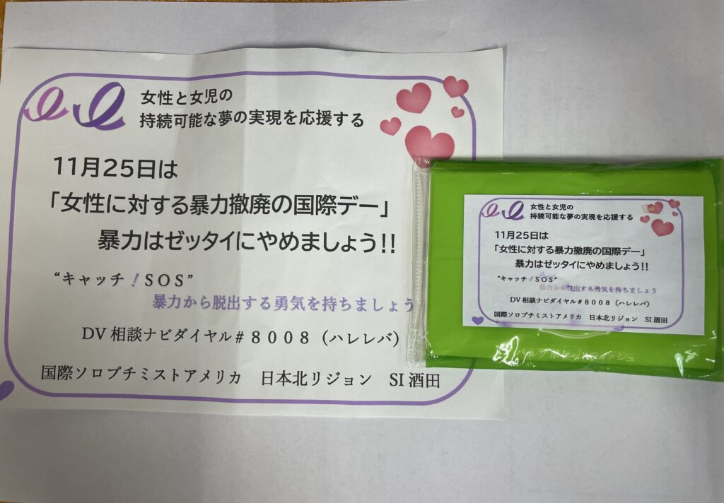 「女性に対する暴力撤廃の国際デー」 2025.12.7 12月7日(日)「女性に対する暴力撤廃の国際デー」理解活動の一館として観光客や住民が多く来店する「さかた海鮮市場」にて当クラブメンバー4名で女性への暴力根絶を目指し、通行人にティッシュペーパーやチラシを配布し、ご理解とご協力を呼びかけました。