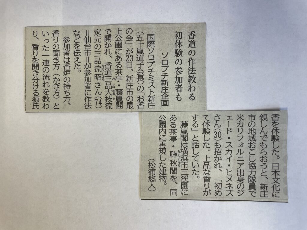 会員10名が参加し、最上公園にある茶亭「藤嵐閣」にて香道三品大枝流家元の三品流昭先生をお迎えして「お香の会」が開かれました。亀綾織の方々や地域おこし協力隊のジェード・スカイ・ヒメネズさんもお招きして香木についてお話をお聞きし一連の流れを教わり香木の香りを聞く日本文化を楽しく体験させていただきました。
