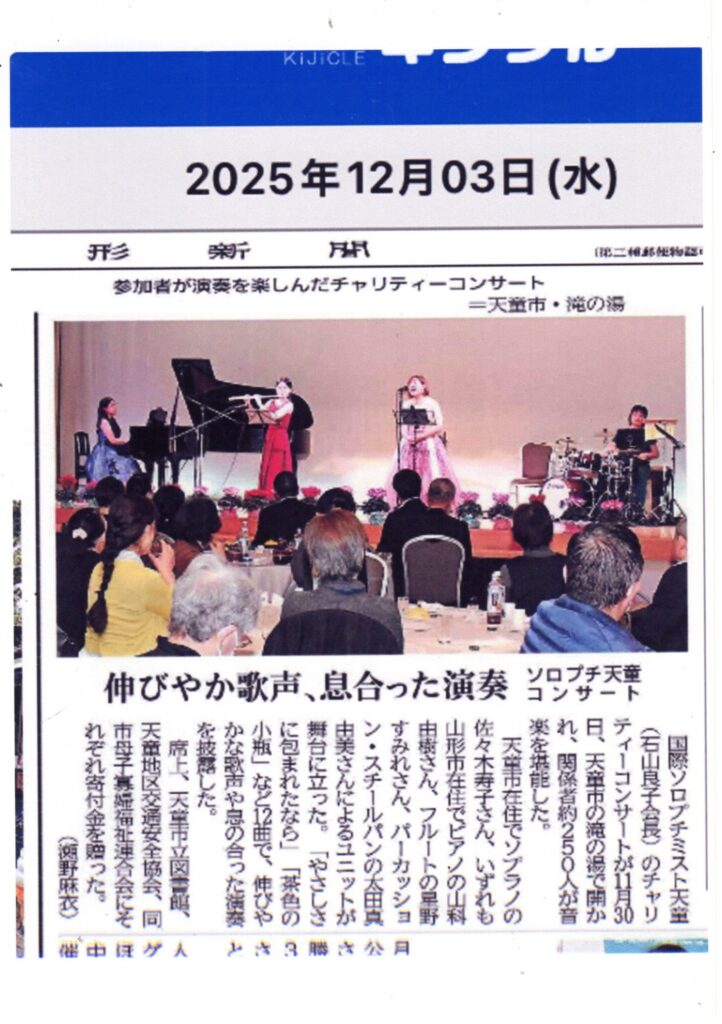 ⒒月30日、チャリティーコンサートを天童市の滝の湯で開催され、関係者約250人が音楽を堪能した。音楽を始まる前15分間のセルモニーをやって、図書館・交通安全協会・寡婦福祉連合会3人に寄付金を贈った。お礼のお言葉、天童市長より頂きました。