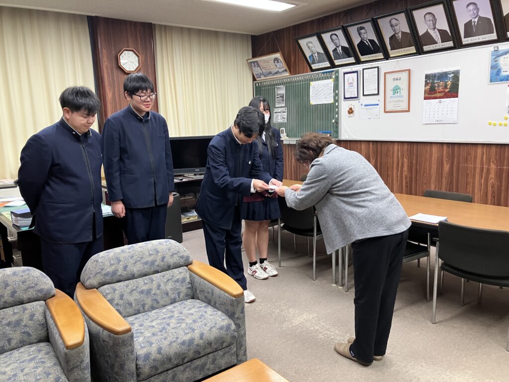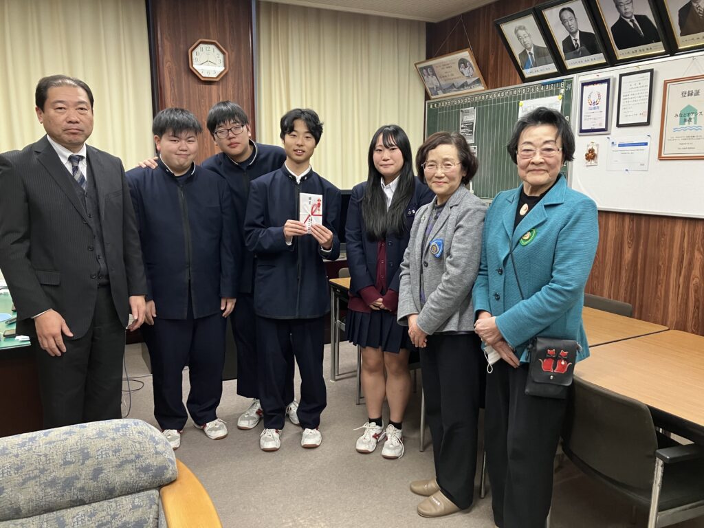 令和7年度SI鶴岡では、県立加茂水産高等学校にクラブ賞を贈呈しました。12月16日 二美会長、日本財団三井委員長、小野寺トレジャラーが訪問しました。一人暮らし高齢者に手作り弁当をお届けする活動を30年続けて参りました。地域への奉仕 素晴らしいと思います‼