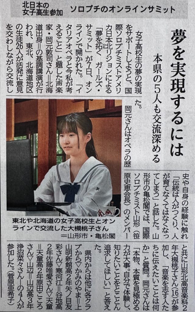 予定している会場でwifiが使えない事が当日わかり、急遽会長が経営している料亭亀松閣の一室をお借りして時間通りに開始する事が出来ました。山形県立山形北高等学校 音楽家2年 大槻桃子さんから出席して頂きました。SI山形から笹原史恵会長他5名が出席しました。 第1部では声楽家岡本敦司さんの「イタリアオペラと今私が考えること」と題した基調講演が行われました。第2部でのワークショップでは音楽科でマリンバを選考している大槻さんは「音楽を志す人達に伝えたい事は何ですか」と積極的に質問しておりました。終わってから「最初は緊張しておりましたが、この度の茶話会に出席できて良かった」と感想を述べてくれました。