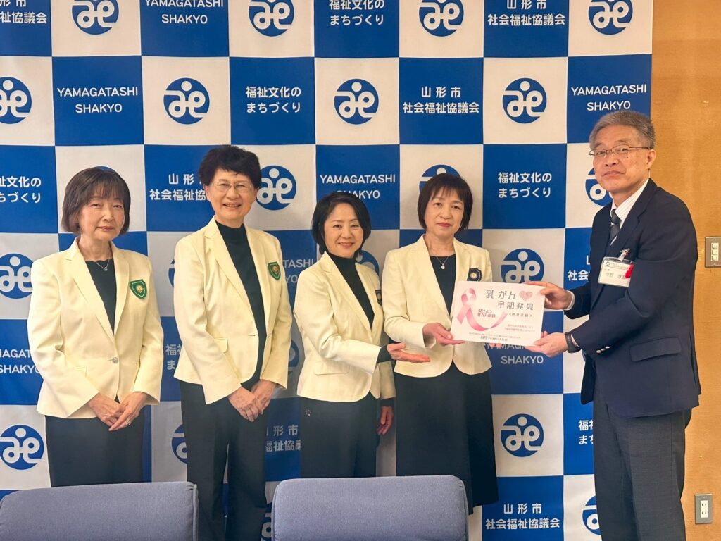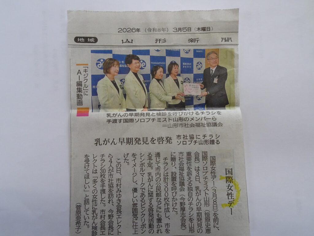 3月8日の国際女性デーにあわせて「乳がん早期発見」啓発チラシ300枚を作成した。チラシは会員の手作りで、毎年趣向を凝らしている。配布先は山形市役所を通して市内コミュニティーセンター20か所へ200枚、市内公民館7か所へ70枚、山形市社会福祉協議会ファーラへ30枚である。このうち、会長エレクト・プログラム委員2名・広報委員1名、計4名が出向いた社会福祉協議会への贈呈は国際女性デーの記事として3月5日の山形新聞に掲載されたほか、電子版山形新聞キジクル(YouTube)に「乳がん早期発見、願いをチラシに 国際ソロプチミスト山形が寄贈」として会長エレクトの談話などが4月まで30日間公開されている。