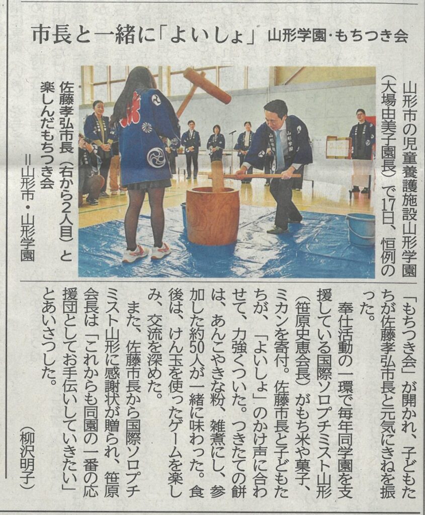 児童養護施設山形学園にて山形市長との餅つき会が開催されました。餅つきの後、笹原会長より市長へ目録(おもち、みかん、菓子)を贈呈、市長より感謝状、謝辞をいただきました。物価高騰に伴い、もち米の価格も高騰していますが、学園の皆様の工夫とご助力により例年通りのサポートをすることができました。「市長さん、ソロプチミスト山形さんと餅つき会を行いました。美味しいおもちの後は『福けん玉大会』今までにないくらい盛り上がりました‼市長さんの上手さにみなビックリしました!」と学園のインスタに載せていただきました。けん玉で負けて泣く子、その子を励ます子たちの姿が心に染みました。これからも支援を継続したいと思います。