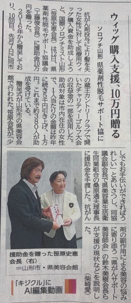 医療用ウイッグ購入資金援助金として10万円を山形県薬剤性脱毛サポート協議会に贈った。10万円は過日のチャリティーゴルフ大会の収益をあてた。贈呈式は山形クラブ笹原会長以下4名・県美容組合2名・がんサポート美容師会2名の参加であった。美容組合からはこの9年間で376名の患者さんが助成金を受けたとの報告を受けた。がんサポート美容師から講習会で得た医学的な知識をもとに抗がん剤の副作用による美容の悩みに寄り添っている話を伺うなど三者で情報交換をおこなった。この援助金は当クラブの継続事業で、すべての女性の夢輝く未来をひらくというソロプチミストの理念・テーマに基づいた事業です。