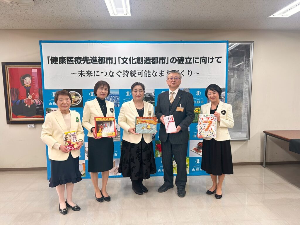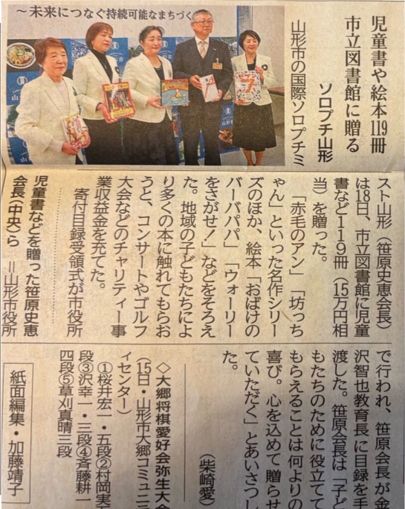 国際ソロプチミスト山形は奉仕活動の一環として、地域への奉仕 山形市立図書館へ児童書119冊を寄付致しました。3月18日山形市役所に於いて、笹原史恵会長他3名で目録をお渡しし、贈呈式に臨みました。チャリティーゴルフ大会、チャリティーコンサートの歳入事業で得た収益金の一部15万円をもとに、地域の子どもたちにより多くの本に触れてほしいとの思いから読書環境の充実に寄付したく、子どもたちの豊かな想像力や知識を育む児童書一式を贈呈致しました。市の教育長さん初め、図書館の方々からも大変喜ばれ、ソロプチミストの活動が誠に意義あるものと実感させられました。未来を担う子どもたちのお役に少しでもたてたことは会員一同の喜びでした。