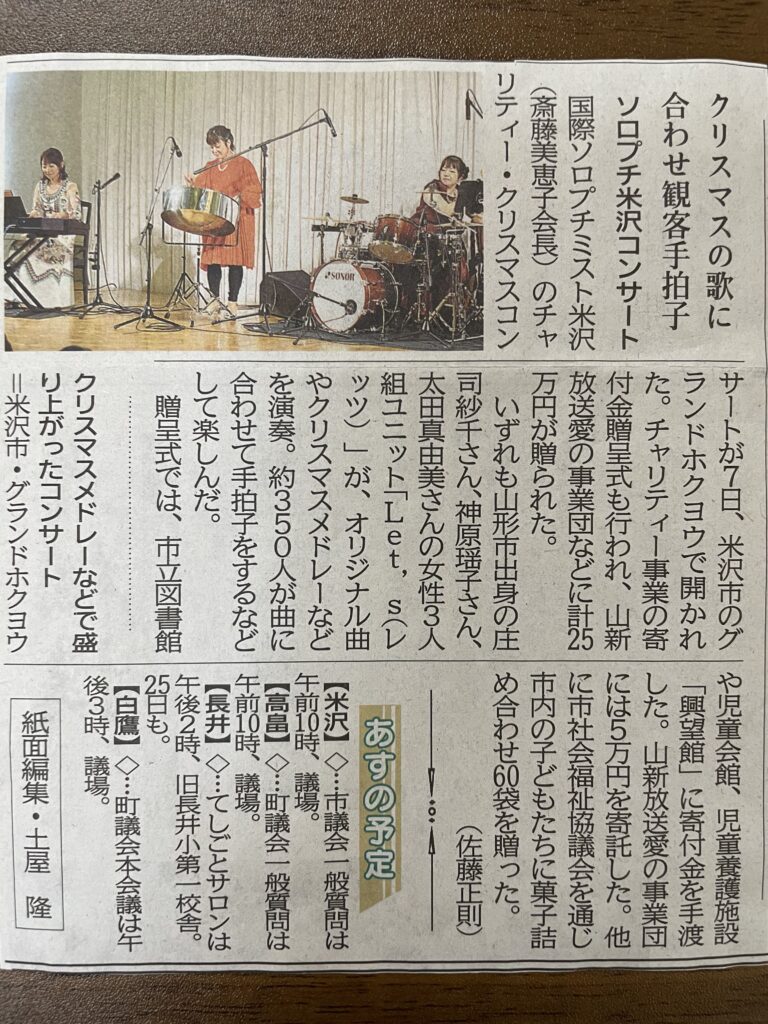 12月7日、チャリティークリスマスコンサートを開催いたしました。今年は山形市出身の女性3人組ユニット『Let‘s(レッツ)』が出演。クリスマスソングや懐かしい青春メドレーなどを演奏。収益金の中から計25万円を、米沢市、児童養護施設、山新放送「愛の事業団」に、助成金及び寄付金を贈呈いたしました。当日は、キャッチSOSキャンペーンとフラワーオークションも同時開催。ご来場の約350名様のあたたかい善意に感謝するとともに、今後も社会奉仕活動に尽力してまいります。尚、11月20日に社会福祉協議会を通じてクリスマスプレゼントとして60名分のお菓子の詰合せを贈呈させていただきました。