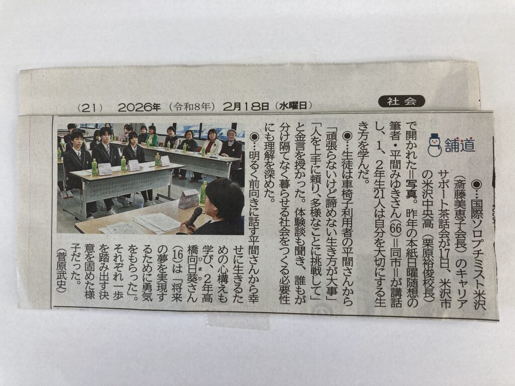 2月17日(火)米沢中央高校会議室にて、第6回高校生のためのキャリアサポート茶話会を開催いたしました。参加者は、先生5名、生徒21名、SI米沢会員10名。講師:ピアカウンセラー平間みゆき氏のご講話をお聴きしました。平間先生のご講話の中で、バリア(障害)があるからこそ人の優しさを感じるという言葉も心に残っています。そして平間先生から生徒さんに贈られた言葉は『知識・仲間・勇気』一歩踏み出す勇気!!で、私たちも勇気をいただきました。